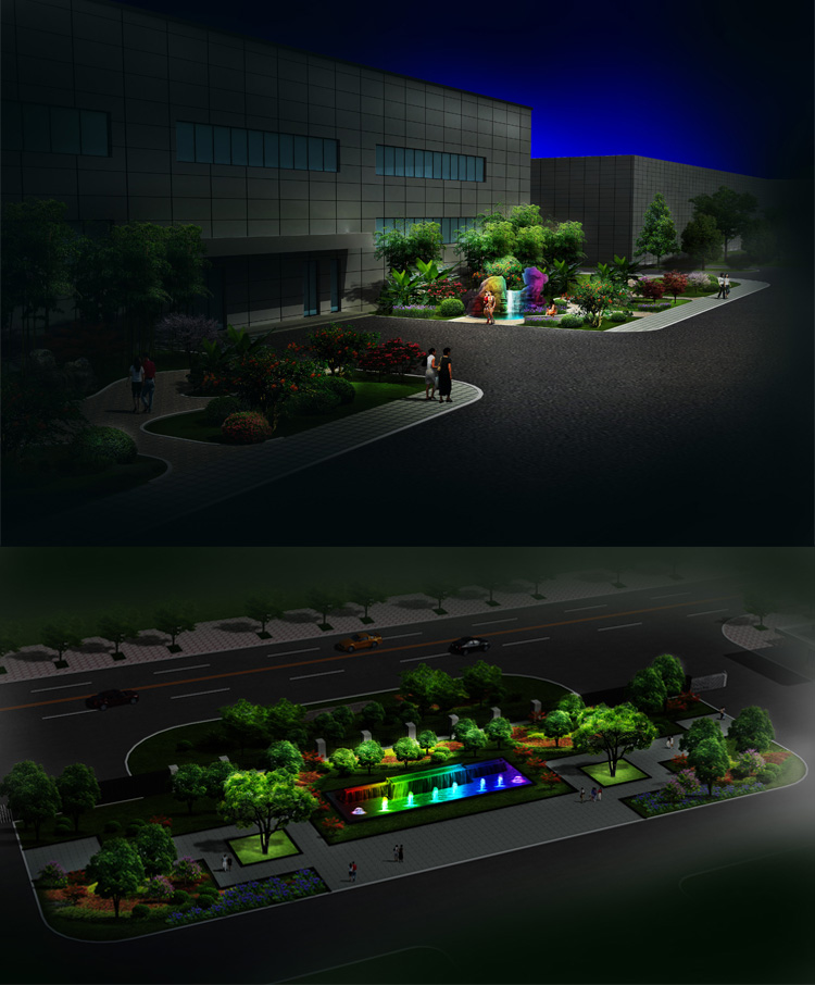 簡(jiǎn)介—— 彩虹廠夜景照明設(shè)計(jì),是結(jié)合廣場(chǎng)噴泉景觀,廣場(chǎng)樹木以及草坪的亮化,設(shè)計(jì)主要采用彩色燈光和暖色白光為主,中心已白光打亮整個(gè)廣場(chǎng),照明路面,周邊樹木圍欄周圍采用線條燈勾勒出輪廓,在用照樹燈給樹木打亮,是廣場(chǎng)的夜晚更加璀璨。